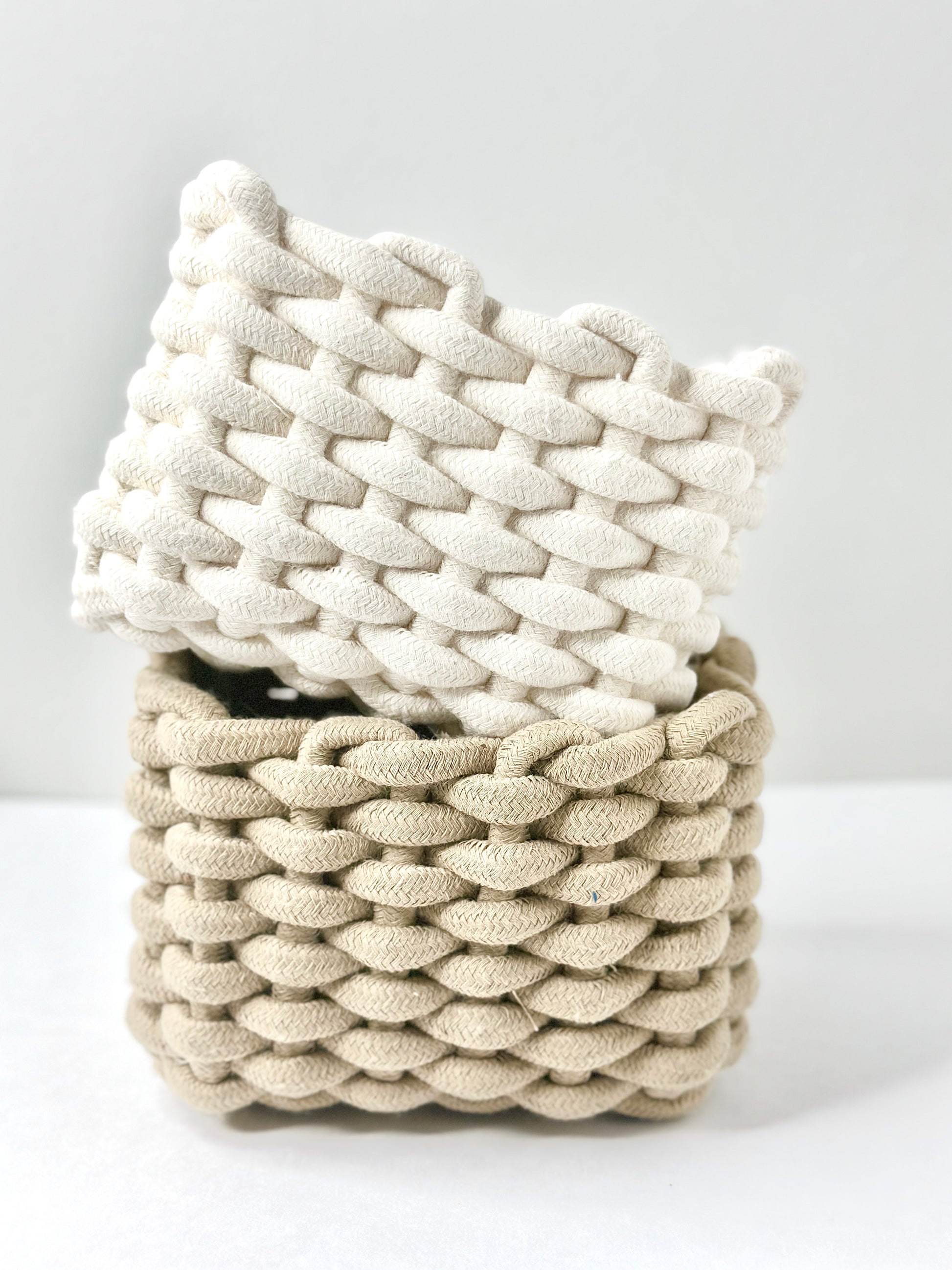 Enhance your organization with this beautifully crafted storage basket. It is meticulously handmade using thick cotton rope for a rustic and natural look. The small size is perfect for organizing smaller items, while the large size offers ample storage space.