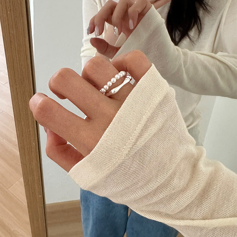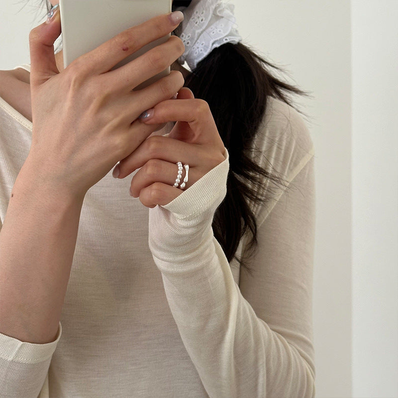 Sterling Silver Double Layer Pearl and Bone Chain Open Ring