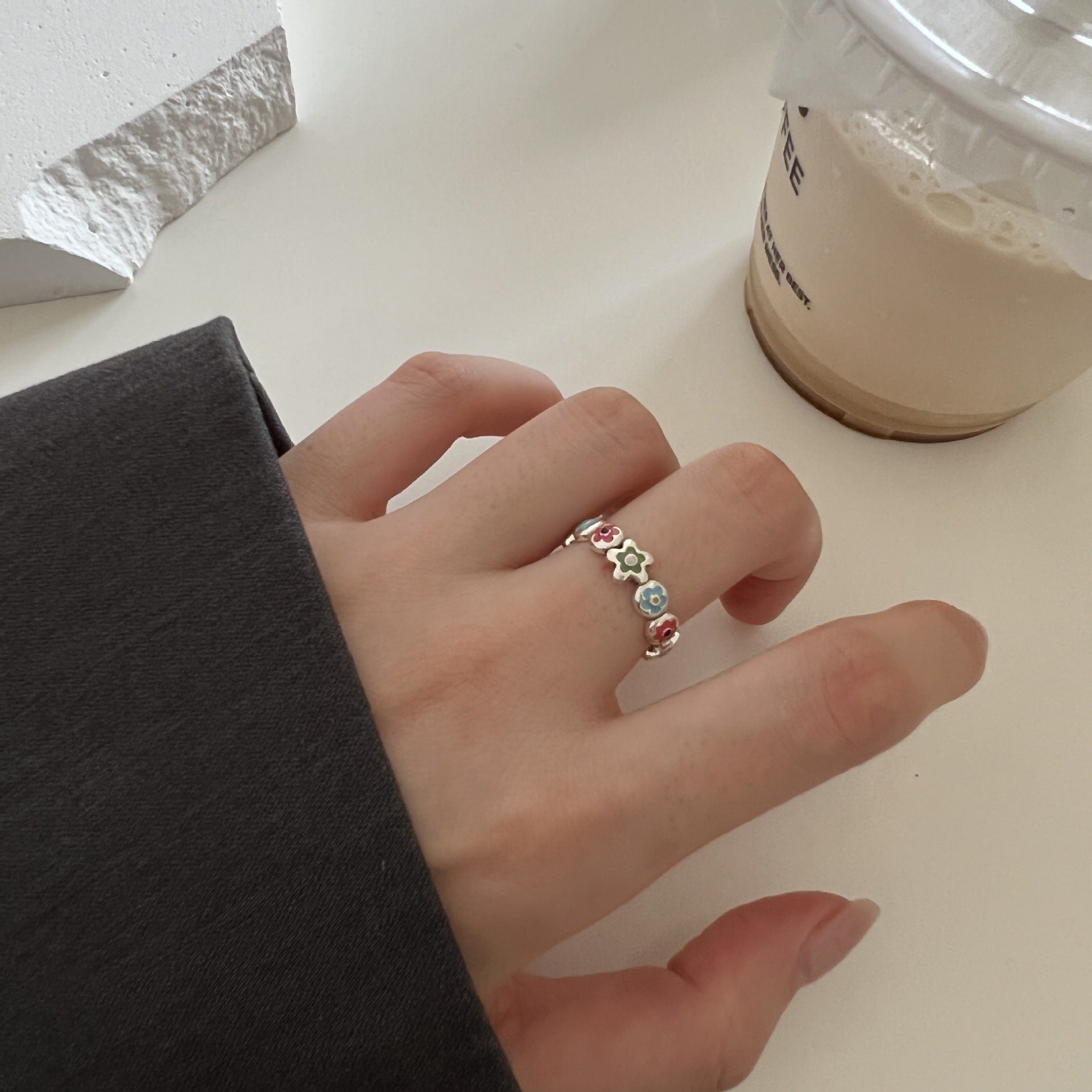 Sterling Silver Epoxy Enamel Flower Chain Open Ring